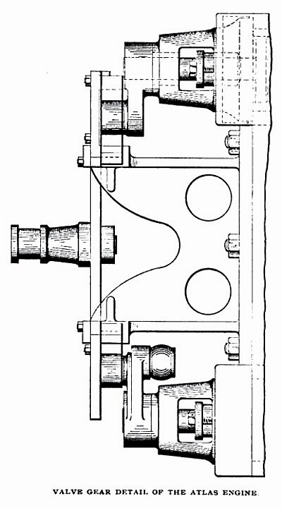 The main valves of the engine are of the piston type, with the two ends extended to meet in the centre, so that when one of them is opened on the steam end, the port connects, not with the steam chest, but with the central space in the valve, ports being cut through from this space to the exterior to connect with the steam chest proper. On the outside of the valves in the steam chests ride simple sleeves which serve as auxiliary cut-off valves, and arc directly under the control of the governor, being, thus, automatic in their action. The main valve on each cylinder is driven by a fixed eccentric. The main valve seat consists of a ring, or rather two rings, made in one piece and connected by several bridges across the port-opening which the space between them forms. The seat is crescent shaped, split and adjustable to fit the valve, by the stem which extends to the upper side of the steam chest, where it can be turned by a box wrench. The adjustment can be easily and quickly made.