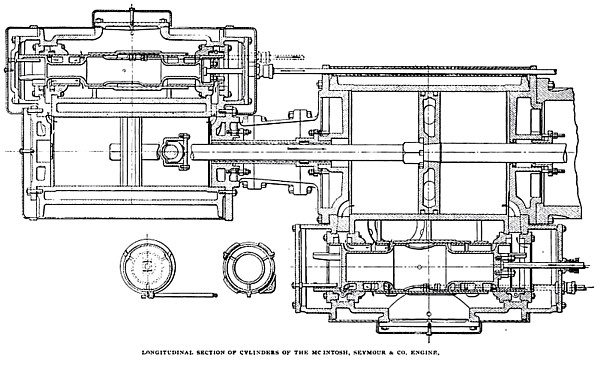 McIntosh, Seymour & Co., of Auburn, N. Y. The high pressure cylinders of this engine measure eighteen, and the low pressure cylinders, thirty-two inches in diameter, while the stroke amounts to three feet. A speed of 112 revolutions per minute is maintained. The sectional view, which is given of one of the pairs of cylinders, will help to give a better idea of some of the principal details of the design.