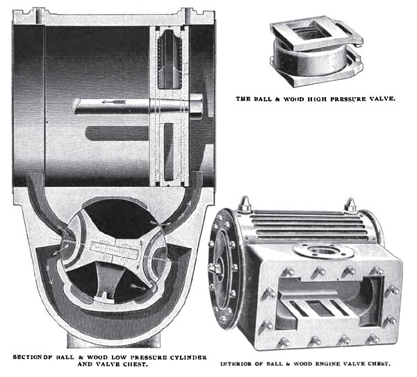 Ball & Wood Company, of New York, show, altogether, five engines, the exhibit being made up of two of their simple automatic engines, with sixteen by sixteen-inch cylinders, rated at 150 horse-power each; two tandem-compound engines with extended base, cylinders measuring thirteen by twenty by sixteen inches, and also rated at 150 horse-power each; and one cross-compound engine of 200 horse-power, with cylinders measuring fourteen by twenty two by twelve inches. The engines are connected by belts to sixteen Brush dynamos, which furnish current for arc lights used in the Exposition grounds. General and detail views of the cross-compound and of one of the tandem-compound engines are given in this number. A feature of these engines which at once attracts attention is the arrangement of the low-pressure valves. It will be observed that the valve chest on the low-pressure cylinder is cylindrical in shape, and is placed transversely to the axis of the cylinder, and directly underneath it. In the sectional view, small arrows in the passages indicate the direction of the flow of the steam, and larger arrows in the moving parts show the direction of their motion. The valve chest is made very large in diameter, so that the steam ports are short and direct. Two double-ported valves, with arc-shaped faces fitting the bore of the valve chest, are placed opposite each other and are mounted loosely on a central valve stem which drives them both and allows both to be held in contact with their faces by steam pressure. Steam is admitted from the valve chest over the edge on the end of the valve, and also through the port in the valve, thus giving a very rapid and wide opening. At the same time the exhaust from the other end of cylinder, has a very direct passage to the condenser. The valve stem carries on its outer end a rock arm which receives motion from a simple crank pin on the outside of the balance wheel, thus dispensing with an eccentric and having all the parts easily accessible. The whole valve mechanism is made very simple by this arrangement, the number of parts is small, and the valves, as already intimated, give a wide and quick opening and follow up their wear with steam pressure. The clearance also is small owing to the short and direct ports, which, moreover, are so located, as will be understood from the illustration, that they readily drain away water accumulations from the cylinder and reduce the chances of accident from such accumulations.