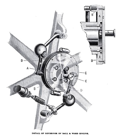 In the governor two eccentrics are used. The main eccentric has a slotted arm, which projects radially and is hung upon a pin, or shaft, having a bearing in the governor frame, as shown above. The secondary eccentric shaft, located below, carries two arms, which are connected by links to the levers supporting the governor weights; the other end of the shaft is a small eccentric, which fits into a block which has vertical play between guides affixed to the arm of the main eccentric.