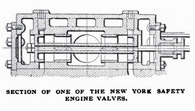 New York Safety Steam Power Company, of New York, one of whose centre-crank engines, slightly different in point of valve detail from the company's standard type, is shown driving some electrical machinery. In this engine, as in the one just described, a relatively small degree of clearance is secured by having the steam ports close to the ends of the cylinder. Unlike the standard type engine, which has only one main valve, the engine on exhibition has two main valves, or, perhaps more correctly speaking, the main valve is made up of two parts, the detail view shown being a longitudinal section through one of them. Each of the parts has its separate valve stem, and the two stems, in turn, are connected and driven by one eccentric rod as shown in the general view.